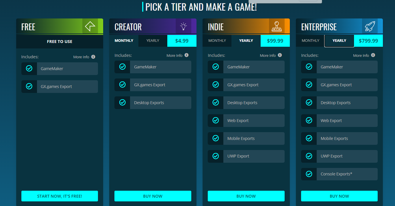 It is free to develop games, you have to pay for exporting it (Sharing to friends)
