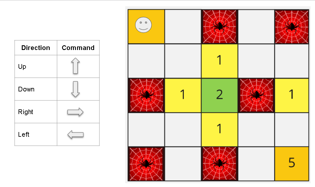 Smile-E the robot is trapped in the board and needs your help! You need to give instructions to Smile-E such that they move across the board, avoid spiders, and reach the exit, which is the square situated in the bottom right of the board.
